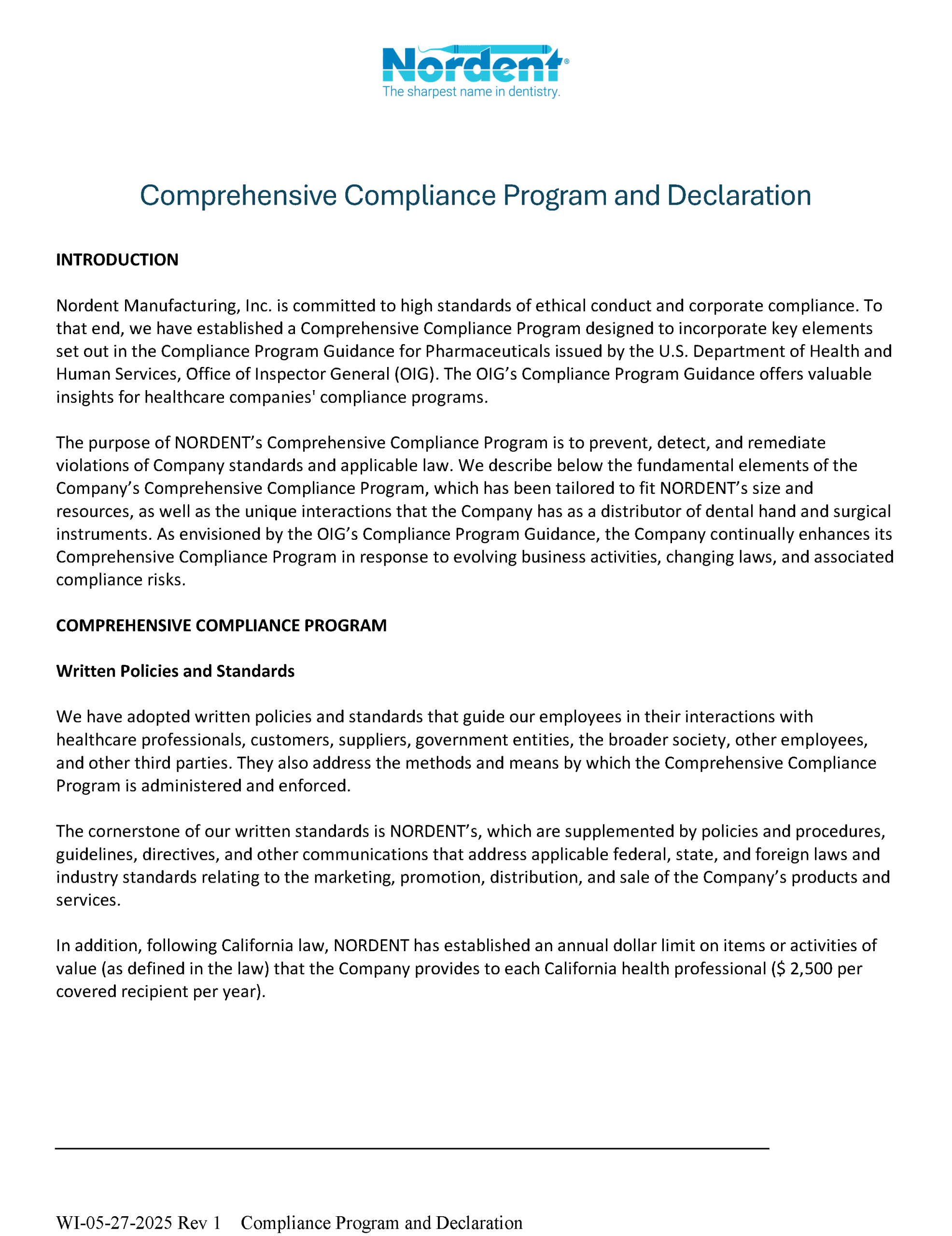 Comprehensive Compliance Program and Declaration