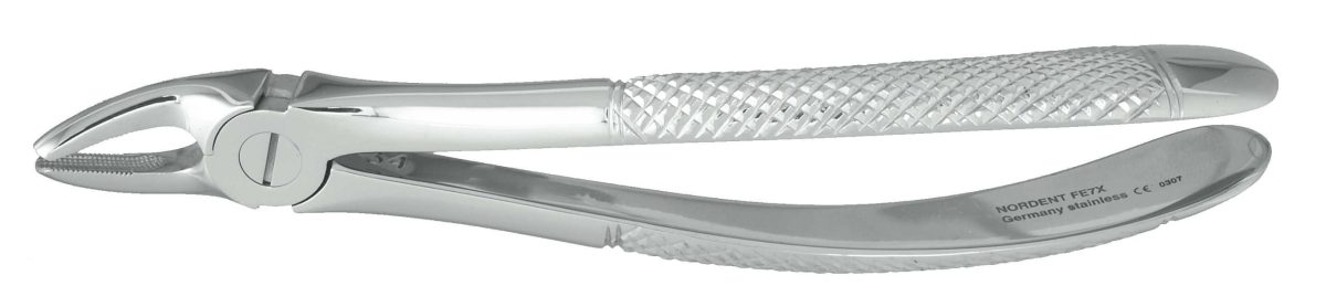 All Nordent forceps are manufactured of a special stainless steel for maximum performance, longevity and corrosion resistance. All forceps are the American style with hidden pins, unless otherwise noted as "English Pattern" which have visible pins. Most forceps can be ordered with serrartions added along the beaks for increased grip along the tooth surface.
