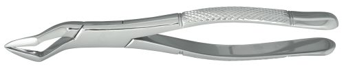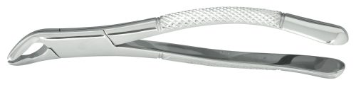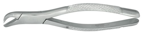 The classic American style pedodontic forceps average 15-16 cm in length. The 150 and 151 "SK" Kinder style forceps with spring handles are only 12 cm in length and can be easily concealed to reduce patient anxiety. All Nordent forceps are manufactured of a special stainless steel for maximum performance, longevity and corrosion resistance. Most forceps can be ordered with serrartions added along the beaks for increased grip along the tooth surface.