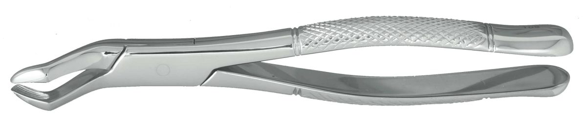 The classic American style pedodontic forceps average 15-16 cm in length. The 150 and 151 "SK" Kinder style forceps with spring handles are only 12 cm in length and can be easily concealed to reduce patient anxiety. All Nordent forceps are manufactured of a special stainless steel for maximum performance, longevity and corrosion resistance. Most forceps can be ordered with serrartions added along the beaks for increased grip along the tooth surface.