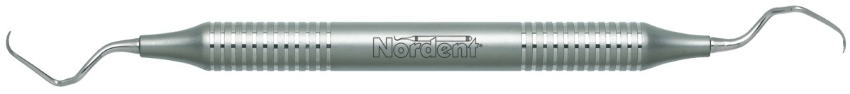Short contra-angle for incisors and cuspids. Terminal shank reach is 11 mm. Nordent standard Gracey curettes feature a blade face curve with a true radius that conforms to tooth anatomy better than any other brand. This means that Nordent standard Gracey curettes are easier to adapt, require fewer strokes, and reduce tissue trauma better than any other brand. Nordent standard Gracey curettes have a 1.1 mm terminal shank diameter and blades that are 0.9 mm wide and 4 mm long. Featuring our DuraLite Hex Handle, additional handle options are shown below.