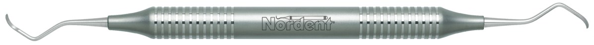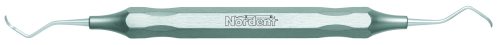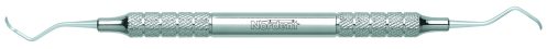 Designed like a Gracey medium contra-angle with an open blade curve and a rigid shank. The blade is 1.1 mm wide with a round toe. The Goldman-Fox series of instruments includes universal curettes, Jacquettes, sickles and hoes. Handle is Medium round, additional handle options are shown below.