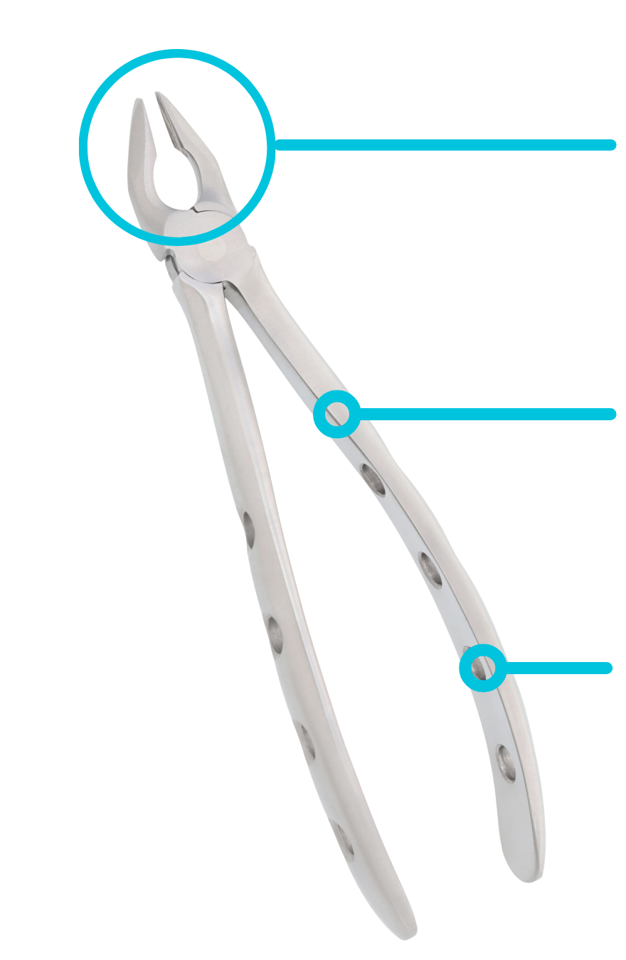 Key features include a finely serrated beak design that provides secure engagement with both crown and root structures, helping to prevent fractures during extraction procedures. The smooth satin finish minimizes glare under surgical lighting, while all edges are carefully smoothed and beveled to support both patient comfort and clinician handling.