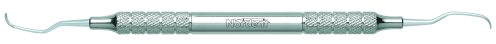 Designed like a Gracey medium contra-angle with an open blade curve and a rigid shank. The blade is 1.1 mm wide with a round toe. The Goldman-Fox series of instruments includes universal curettes, Jacquettes, sickles and hoes. Handle is Medium round, additional handle options are shown below.