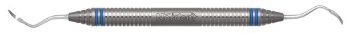 Combines a moderate size, medium-reach sickle that has a blade width of 0.9 mm that tapers to a point with a universal curette that has sharp cutting edges on both sides of the blade and a rounded toe. The Long Reach curette has a 0.8 mm blade width and a 1 mm diameter terminal shank with a 12 mm reach. Handle is Medium round, additional handle options are shown below.