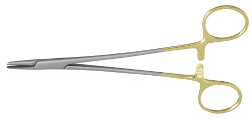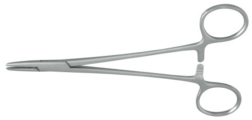 Very fine serrations on narrow profile jaws with carbide inserts. The locking mechanism is activated by squeezing the spring-action handle. This is a great needle holder for periodontal applications where a very fine suture is used. (5" / 140mm)
