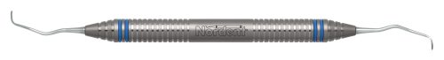 Has bends similar to the Gracey 11-12. The terminal shank is 1 mm in diameter and 9 mm long with a blade width of 0.9mm. Featuring our DuraLite® ColorRings™ Handle, additional handle options are shown below.