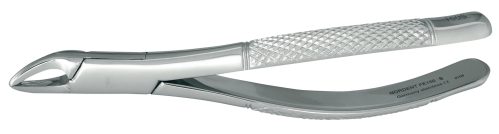 The classic American style pedodontic forceps average 15-16 cm in length. The 150 and 151 "SK" Kinder style forceps with spring handles are only 12 cm in length and can be easily concealed to reduce patient anxiety. All Nordent forceps are manufactured of a special stainless steel for maximum performance, longevity and corrosion resistance. Most forceps can be ordered with serrartions added along the beaks for increased grip along the tooth surface.