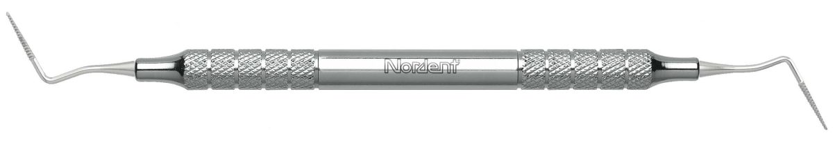 Interdental "push-pull stroke", curved file with two non-cutting surfaces per tip.