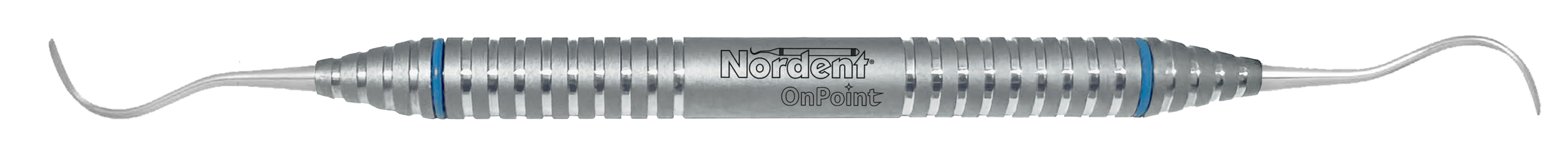 The shank curvature adapts easily to 2nd and 3rd molars. The straight-sided universal blade has a rounded toe and is 1 mm wide. McCall curettes have universal blades with sharp cutting edges on both sides of the blade.