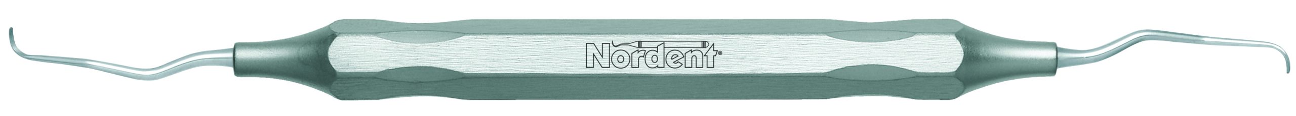 All mesial surfaces of bicuspids and molars. Nordent Mini Blade Long Reach Gracey curettes have a shorter, narrower blade and an extended terminal shank that is 3 mm longer than standard. They feature our blade face curve with a true radius that conforms to tooth anatomy better than any other brand. This means that Nordent Gracey curettes are easier to adapt, require fewer strokes, and reduce tissue trauma better than any other brand. Nordent Mini Blade Long Reach Gracey curettes have a 1 mm terminal shank diameter and blades that are 0.7 mm wide and 3 mm long. Featuring our DuraLite Hex Handle, additional handle options are shown below.
