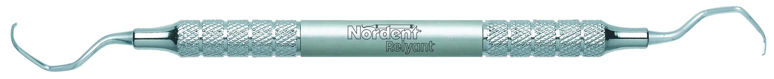 Modified version of the Gracey 13-14 allows better access and a more comfortable hand and finger position for all distal surfaces of bicuspids and molars. The terminal shank reach is 7 mm. Nordent standard Gracey curettes feature a blade face curve with a true radius that conforms to tooth anatomy better than any other brand. This means that Nordent standard Gracey curettes are easier to adapt, require fewer strokes, and reduce tissue trauma better than any other brand. Nordent standard Gracey curettes have a 1.1 mm terminal shank diameter and blades that are 0.9 mm wide and 4 mm long. Featuring our Relyant® Handle, additional handle options are shown below.