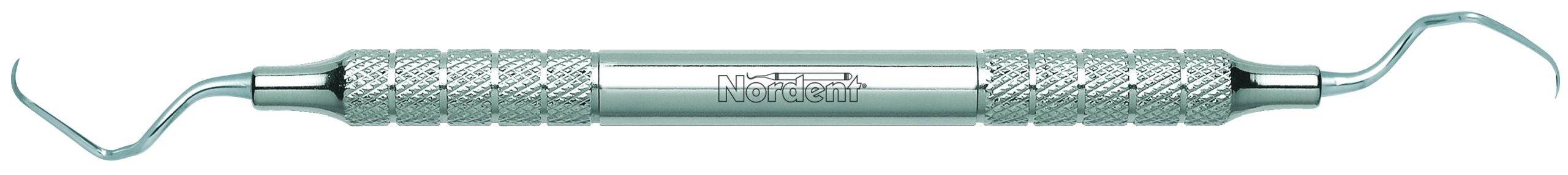 Modified version of the Long Reach Gracey 13-14 allows better access and more comfortable hand and finger position for all distal surfaces of bicuspids and molars. Nordent long reach Gracey curettes have an extended terminal shank that is 3 mm longer than standard. They feature our standard blade face curve with a true radius that conforms to tooth anatomy better than any other brand. This means that Nordent standard Gracey curettes are easier to adapt, require fewer strokes, and reduce tissue trauma better than any other brand. Nordent standard Gracey curettes have a 1.1 mm terminal shank diameter and blades that are 0.9 mm wide and 4 mm long. Handle is Medium round, additional handle options are shown below.