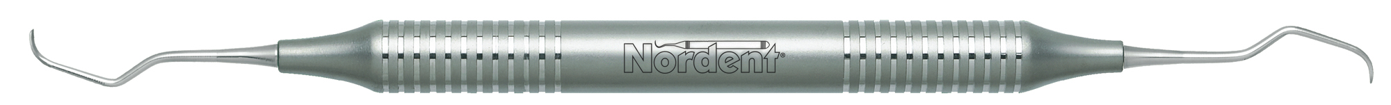 Short contra-angle for incisors and cuspids. Terminal shank reach is 11 mm. Nordent standard Gracey curettes feature a blade face curve with a true radius that conforms to tooth anatomy better than any other brand. This means that Nordent standard Gracey curettes are easier to adapt, require fewer strokes, and reduce tissue trauma better than any other brand. Nordent standard Gracey curettes have a 1.1 mm terminal shank diameter and blades that are 0.9 mm wide and 4 mm long. Featuring our DuraLite Round Handle, additional handle options are shown below.