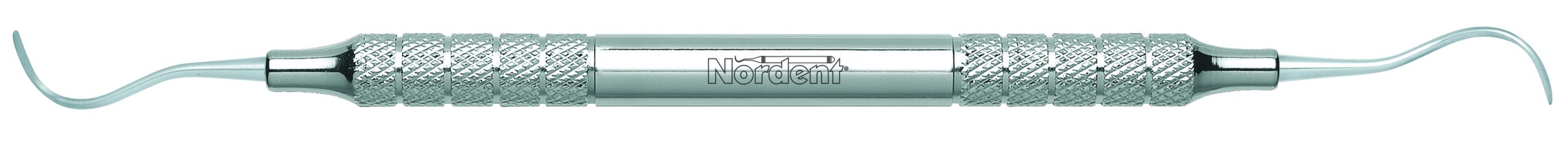 The shank curvature adapts easily to 2nd and 3rd molars. The straight-sided universal blade has a rounded toe and is 1 mm wide. McCall curettes have universal blades that have sharp cutting edges on both sides of the blade. Handle is Medium round, additional handle options are shown below.