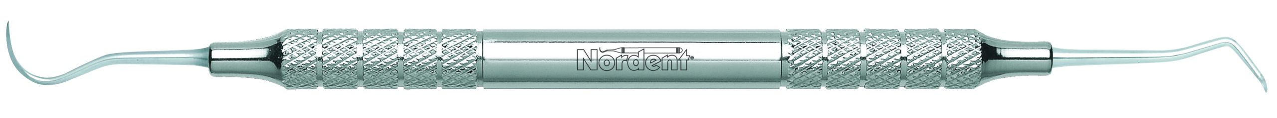Combines the standard N5 sickle that has a 0.9 mm blade width that tapers to a point with a long reach contraangle spoon blade hoe that has a blade diameter of 2 mm for anterior lingual surfaces. Handle is Medium round, additional handle options are shown below.